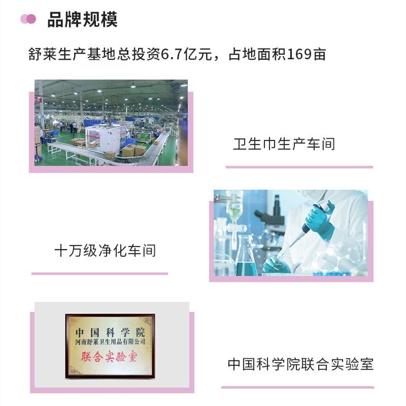 作为老牌国货品牌,舒莱一直把产品质量放在首位,自主生产研发,品牌规模不断发展壮大。目前舒莱拥有长江以北最大的卫生巾生产基地,生产基地总投资6.7亿元,占地面积169亩,建设有卫生巾生产车间、十万级净化车间、中国科学院联合实验室等。其中卫生巾高速全伺服生产线就有14条,口罩平面及N95/N94全自动生产线9条,能实现年产60亿片系列卫生用品和具备年产2.5亿片医用和防护口罩以及医用耗材的生产能力。