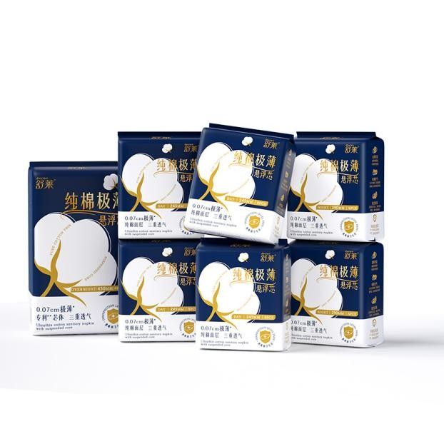 纯棉极薄悬浮芯卫生巾以100%纯棉+0.07cm极薄+消毒级+抗菌+立体悬浮芯设计,主打纯棉极薄、更柔软舒适,能更好呵护敏感肌;