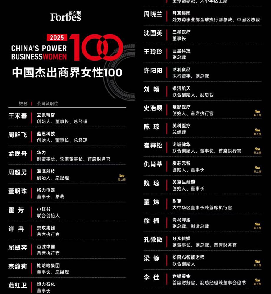 2025年3月8日,福布斯中国第11次发布“中国杰出商界女性100”榜单。该榜单覆盖中国内地、香港、澳门三地上市企业女性高管、跨国公司在华女性负责人及独角兽企业女性创始人,综合经营业绩、创新力、行业影响力等六项指标评选。