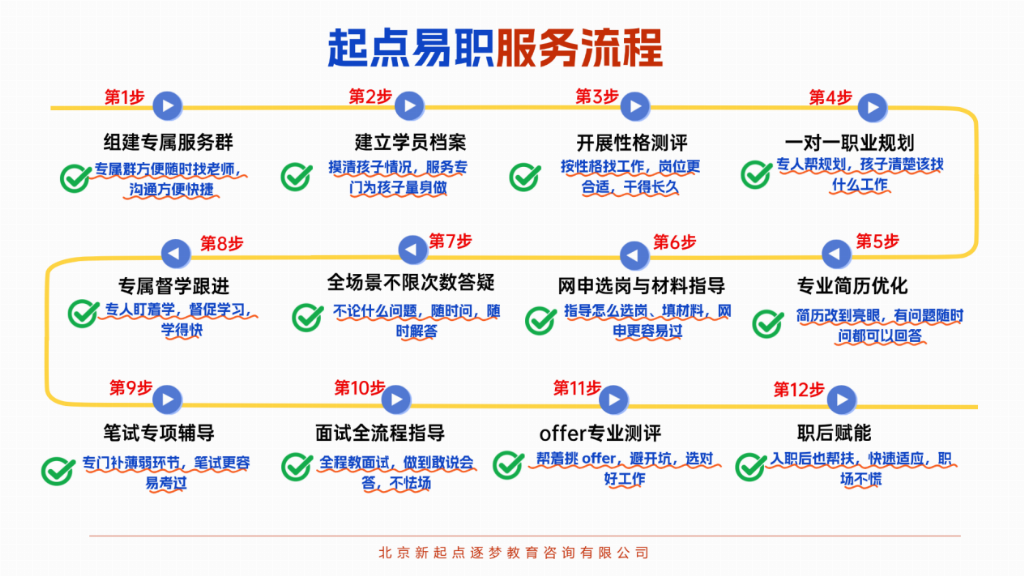 更为独特的是,小程序并非简单替代人工,而是与起点易职“14对1”专属服务模式深度融合。系统自动生成的选岗匹配报告,包含岗位详情、匹配度分析、差距诊断(如“缺少党员身份”“英语六级未达标”等),实时同步至14对1专属服务群。14位职能导师(职业规划师、选岗顾问、简历专家、笔试讲师、面试官、心理督学、教研顾问、技术运维、服务监督等)据此进行“人工精筛”,剔除系统中可能遗漏的特殊限制条件(如“仅限京内生源”“要求特定竞赛奖项”等),并动态调整学员备考节奏。