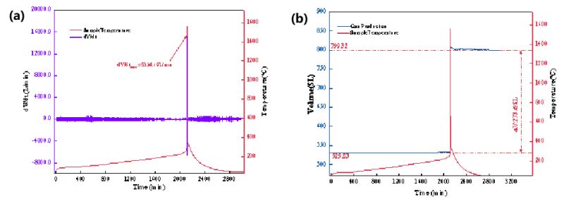 图3 三元九系电池热失控(a)产气速率曲线及(b)产气量曲线
