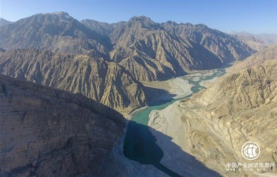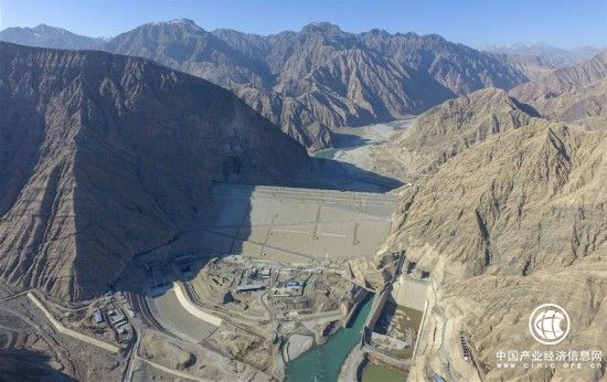 从空中俯瞰叶尔羌河阿尔塔什水利枢纽工程水库大坝(记者 赵戈 11月19日无人机拍摄)。