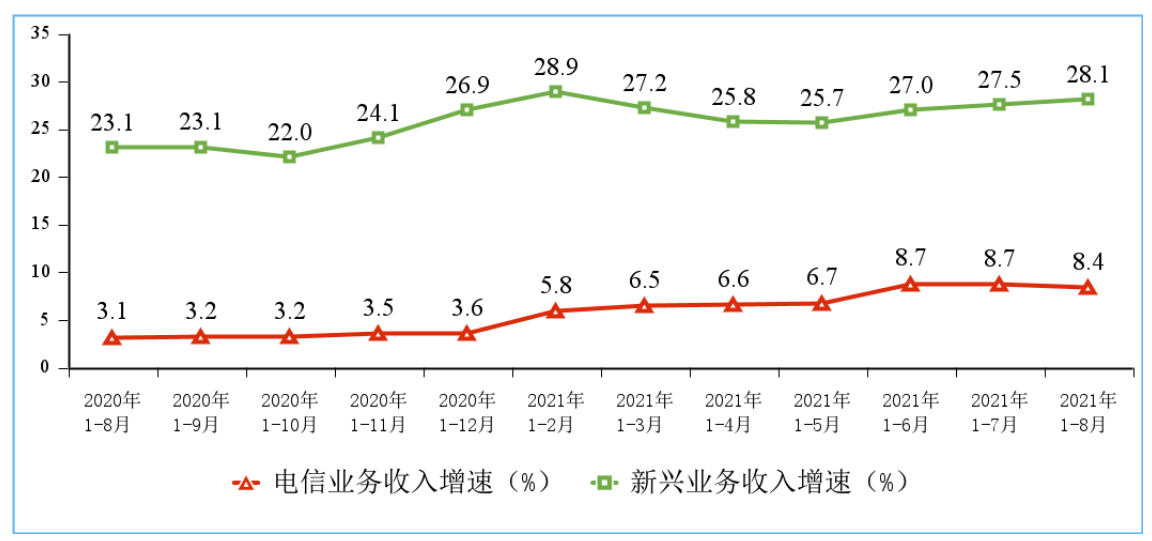 近日,工信部发布了《2021年1-8月份通信业经济运行情况》。数据显示,今年1-8月份,我国电信业务收入稳步增长。1-8月份,电信业务收入累计完成9919亿元,同比增长8.4%,增速同比提升5.3个百分点。按照上年不变价计算的电信业务总量为10932亿元,同比增长27.5%。