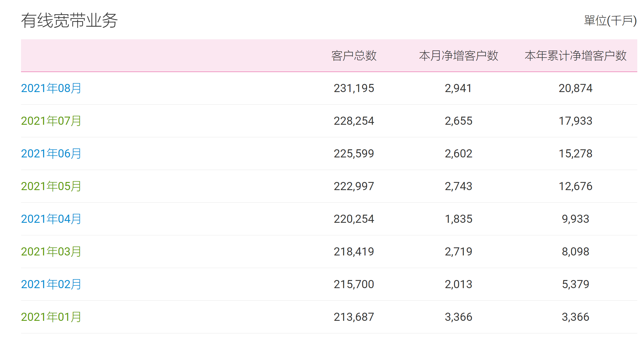 当月,中国移动有线宽带客户数净增294.1万户,累计达到2.31195亿户。
