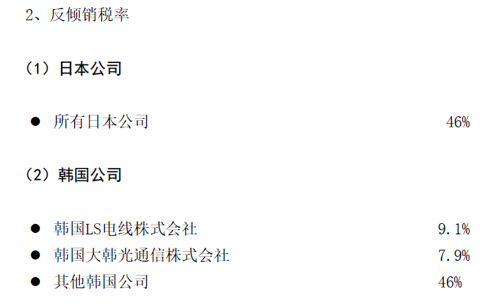 公告显示,2005年1月1日,商务部发布2004年第96号公告,决定对原产于日本和韩国的进口非色散位移单模光纤征收反倾销税。经期间复审及期终复审,该措施将于2021年12月31日到期,目前日本公司税率为46%,韩国公司税率为7.9%-46%。