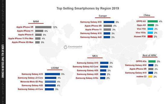 Counterpoint还列出了2019年不同地区销量排名前五的智能手机。美国市场被iPhone主导,三星的产品未能进入前五。在南美市场,摩托罗拉一款智能手机也进入了前五。欧洲和亚太除中国外其他市场被iPhone和三星主导。但在中国情况完全不同,前五名来自OPPO、Vivo和华为。