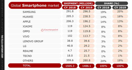 市场研究公司Counterpoint近日发布了2019年全球智能手机销量数据。数据显示,苹果、三星和OPPO进入前10。