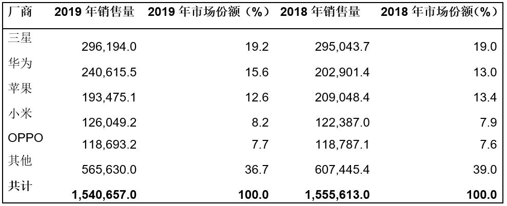 表二、2019年全球各厂商售给终端用户的智能手机数量(单位:千部)