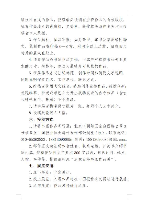 1.请将书画作品寄送至:北京市朝阳区金台西路2号3号楼5层中国报业协会对外合作部张润生(收),联系电话:010-65363823、18813090085;邮箱:18813090085@163.com。