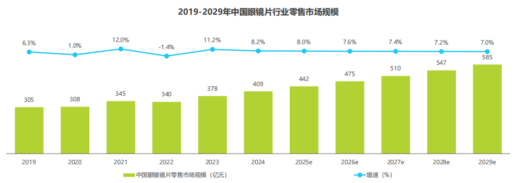 镜片作为实现眼镜功能的核心部件,根据艾瑞咨询测算,2024年镜片市场零售规模约409亿元,占整体眼镜零售市场的44%,预计2029年可达585亿元,年平均复合年增长率将稳定在6%~8%,市场稳步扩张。