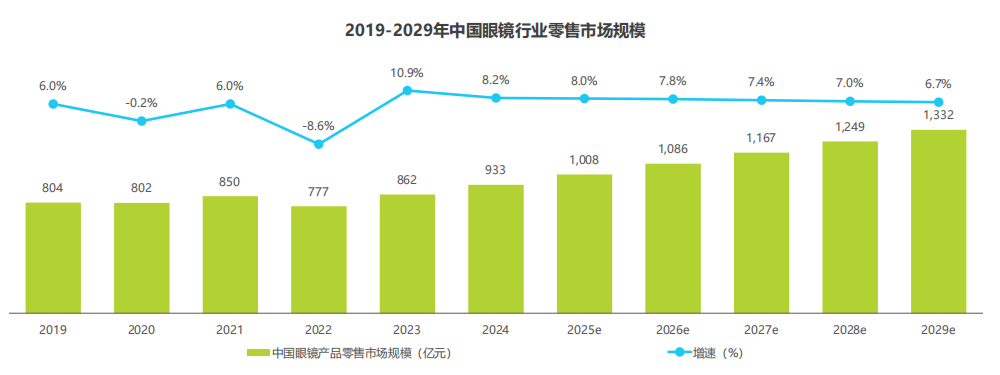 白皮书报告指出,2024年中国眼镜零售市场规模约933亿元,同比增长约8.2%。2025年,预计将突破1000亿元大关,到2029年有望达到1332亿元,复合年增长率约7.4%,中国眼镜行业整体规模,呈现持续增长之势。