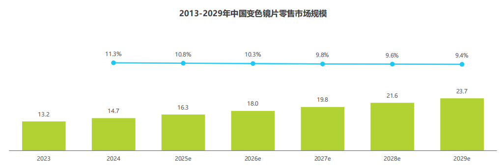 根据艾瑞咨询测算,2024年中国变色镜片零售市场规模约14.7亿元,约占整体镜片市场的3.6%。2029年将增长扩容至23.7亿元,2024~2029年年均复合年增长率约10%左右,高于整体市场表现,呈现稳定扩容之势。