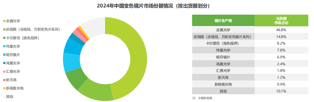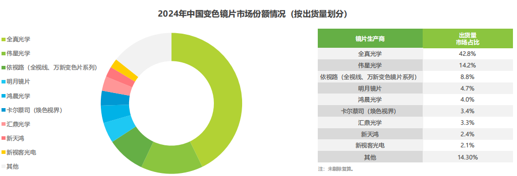 从出货量看,全真光学依然以42.8%的占比位居第一,这意味着市场上平均每售出10片变色镜片,约有4片来自全真光学,显示其巨大的市场铺货量,在变色镜片市场具备明显的主导优势。