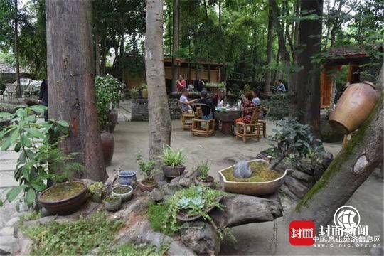 步入猪圈咖啡厅,首先映入眼帘的便是林木深深的川西林盘聚落,笔直茂盛的林木撑起一片绿荫天空。茂林树下,来自四面八方的游客在此品一杯川西盖碗茶,偷得一份浮世清闲。