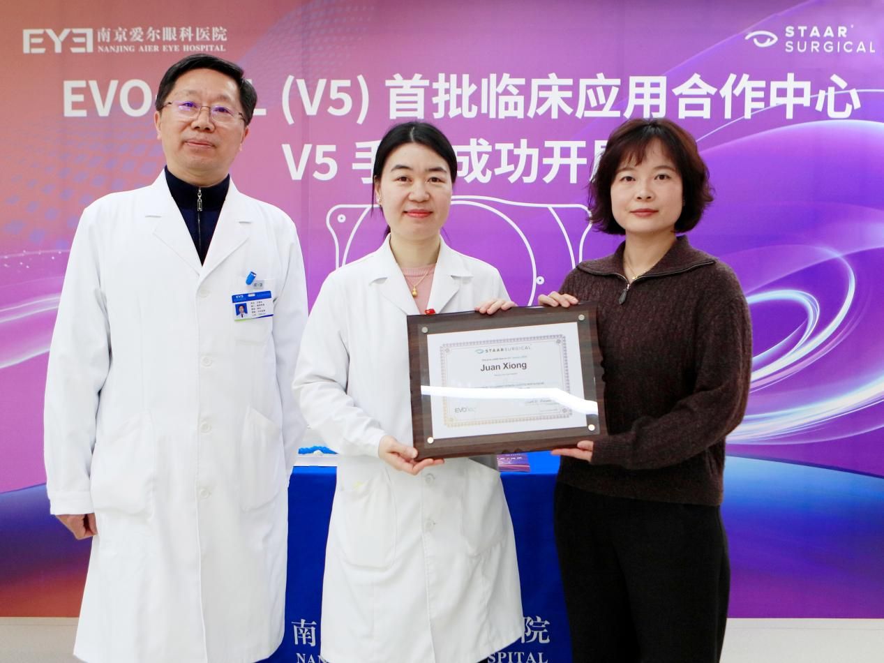 1月13日,全球领先的眼内屈光矫正技术迎来新的里程碑。在南京爱尔眼科医院举行的授牌仪式上,瑞士STAAR Surgical公司正式授予南京爱尔眼科医院“EVO+ ICL (V5) 首批临床应用合作中心”资质,同时授予医院屈光手术科主任熊娟“EVO+ ICL (V5) 认证手术医师”证书。这标志着该项以优化夜间视觉为核心优势的国际新一代近视矫正技术,在南京地区获得了官方的临床应用许可与专家认证,江苏地区的近视患者将能更便捷地享受到与国际同步的“日夜高清”视觉体验。