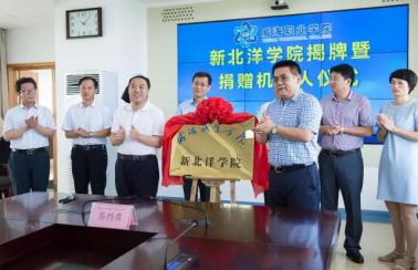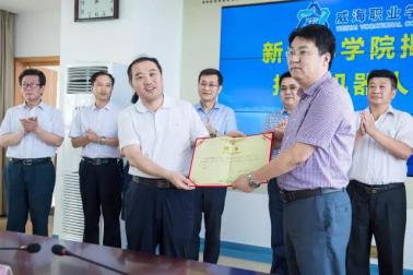 新北洋董事长丛强滋与威海职业学院党委书记吴永刚为新北洋学院揭牌