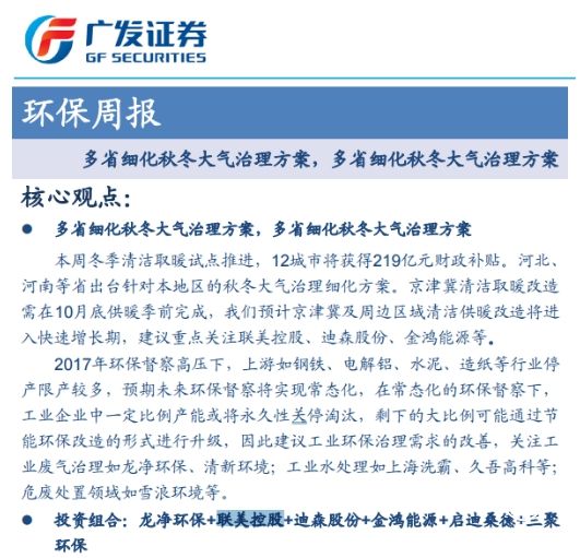 广发和申万宏源的环保周报中,都分析了雾霾治理政策的利好板块,并推出了环保板块的投资组合,其中均包括了环保供暖个股联美控股。