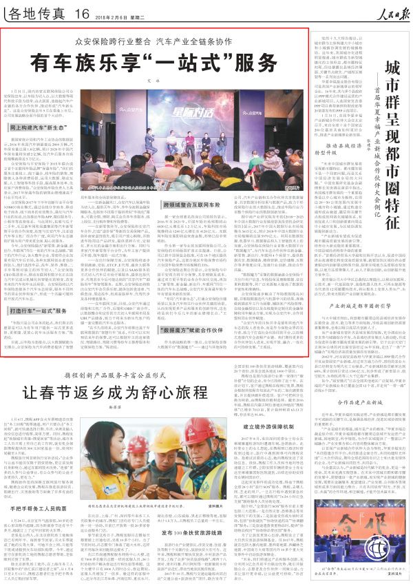 1月31日,《人民日报》刊登了“有车族乐享‘一站式’服务”文章,文中对国内首家互联网保险公司众安保险首创的“汽车新生态”进行了全面的解读。众安保险宣布,以车险为切入点,以大数据等现代科技手段为纽带,由点到面,连接起汽车产业链的各方合作伙伴,推动形成“汽车新生态”。这是众安保险去年9月在香港上市后,公司发展战略全面升级的首个大动作。