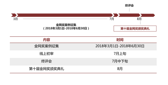 本届金网奖奖项征赛于3月1日开放,6月30日截止,7月份紧张的线上初审及线下终评过后,于8月迎来第十届金网奖颁奖典礼,所有获奖作品及企业、人物、产品将在金网舞台上获得至高无上的荣誉和表彰。