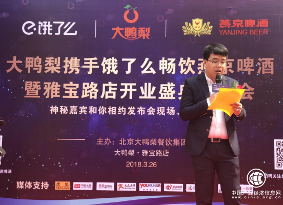 3月26日,大鸭梨雅宝路店开业盛典发布会在北京雅宝路隆重举行。出席本次发布会的有大鸭梨总经理郭琦、大鸭梨事业部总经理李丽、饿了么华北大区总监侯俊杰、燕京啤酒股份有限公司北京销售分公司销售部部长单洪亮先生,以及神秘嘉宾侯震鹏等,众战略合作伙伴、主流媒体等与大鸭梨代表共同见证大鸭梨品牌魅力。当天,大鸭梨线下门店重点推出了金牌烤鸭感恩回馈消费者,售价仅18.8元/份。