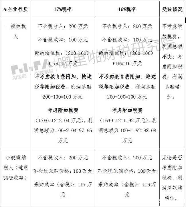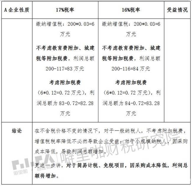 在17%和16%税率下,A企业的受益情况是怎样的?我们通过下表说明: