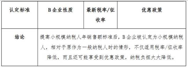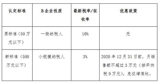案例2:假设从事货物生产的B企业年应税销售额60万元,小规模纳税人的年销售额标准由50万元提升至500万元,认定前后的情形如下所示: