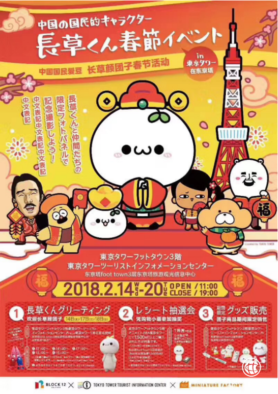 文创产品、IP授权也成为2018年我国在海外开展“欢乐春节”活动的新焦点。今年春节期间,国民形象IP“长草颜团子”与十二栋文化旗下其他原创动漫形象制冷少女、旱獭、熊卷等一起受邀登上日本东京塔与轻井泽购物广场进行展示,与游客进行亲密互动,将浓浓的中国年味儿带到海外。