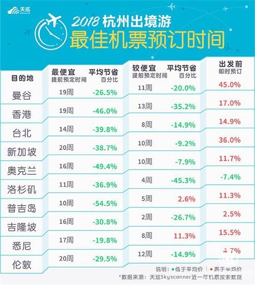 从杭州出发,在20周以内的最佳订票时间预订机票平均可节约39.83%,而在次佳订票时间预订机票平均可节约9.12%。仅提前4周预定去往洛杉矶的机票也可享受45.3%的优惠。