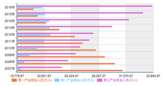 同时,新动能不但保障了经济繁荣,所创造的新增就业岗位也大超此前,2016年第三产业就业人数3.38亿,占比43.5%。就业带动居民收入近年来显著提高,随之而来促进消费成主动能。