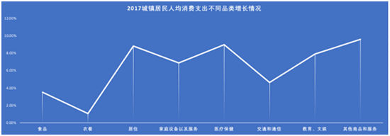 另一方面,高层次消费需求的涌现也是我们不可忽视的。从下图《2017年城镇居民在不同品类的支出增长情况》,我们可以看到医疗保健、教育、文化娱乐和其他商品服务的消费增速已经同居住消费增速相当。说明居民对高品质生活、精神领域追求越来越重视。