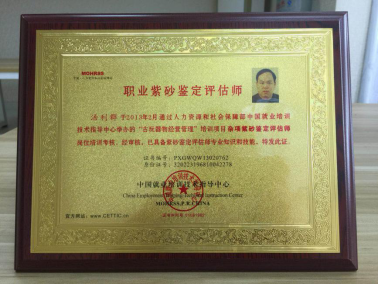 2013年获得人力资源和社会保障部中国就业培训技术指导中心的紫砂鉴定评估师从业资格