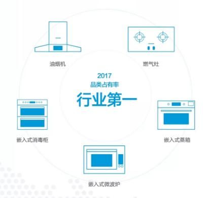 相关数据显示,厨电市场在售品牌接近600家,但大部分市场却被几家颇具实力的品牌所占据,其中就以老板电器为首。据中怡康数据显示,2017年老板电器吸油烟机零售量与零售额、燃气灶零售量与零售额、消毒柜零售额均持续保持行业第一。除此之外,老板电器嵌入式产品市场份额大放异彩,嵌入式蒸汽炉、嵌入式微波炉排在首位。