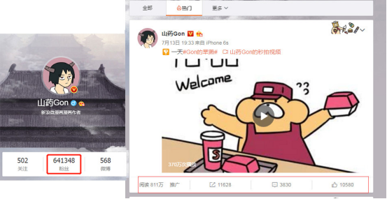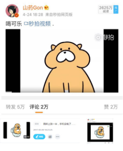 2017年4月24日,旱獭形象的作者山药gon在微博发布了《Gon的旱獭》第一条短视频《喝可乐》,在24小时内获得5万+转发,2万+评论,该条微博阅读量超过2600万,视频播放量超过1300万。
