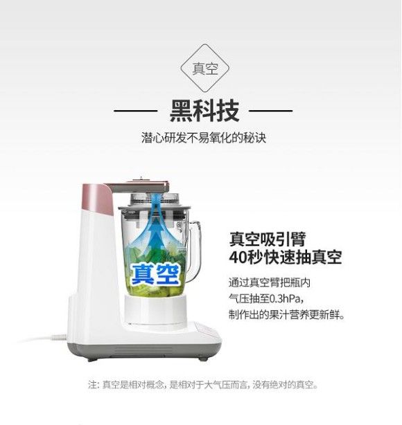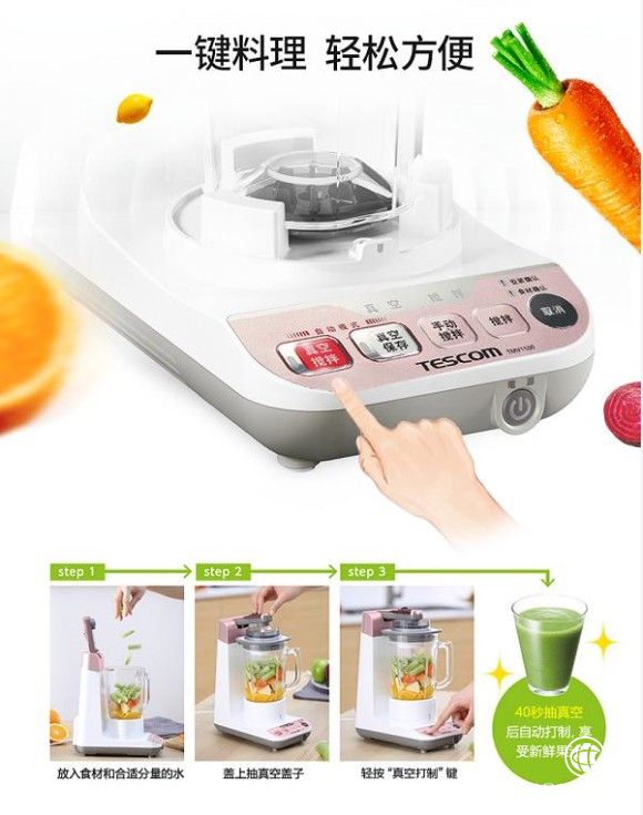 在拥有较高颜值的同时,TMV1550真空料理机还拥有非常优秀的性能。你尝过真空料理机打出来的果汁吗?你知道一杯极鲜的果汁是什么味道的吗?TESCOM运用“真空”的技术,提供给消费者易于饮用成分劣化率极低的新鲜果汁,仅20S抽至珠峰气压0.3h Pa,果汁能达到世界最高峰珠峰上的鲜度,开创了另一种真空料理主张。