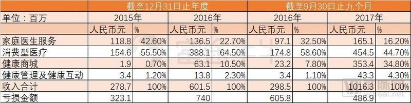 从细分业务来看,平安好医生的第一大收入(2017年1~9月)来自消费型医疗,其次是健康商城和家庭医生服务。