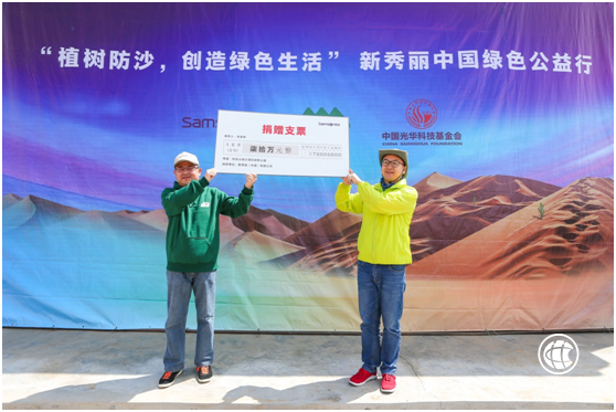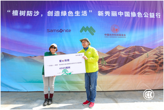 2017年7月,新秀丽中国首次与韩中文化青少年协会[未来林]合作的中国土地荒芜(沙漠、荒漠化)地区“新秀丽绿色生态园建设项目”就已正式启动。2018年新秀丽(中国)有限公司继续进行“植树防沙,创造绿色生活”公益行项目,4月21日捐赠仪式活动现场,新秀丽(中国)有限公司的企业代表——大中华区财务总监陈灵国先生正式向韩中文化青少年协会[未来林]捐赠七十万人民币的支票,用于继续支持推行2018年一整年植树防沙绿色公益。同时新秀丽(中国)有限公司 “以心换新 行无止境”市场公益活动代表——大中华区市场总监吴永红女士则代表所有参与换购公益活动的顾客正式向韩中文化青少年协会[未来林]捐赠4985棵树苗,将来自全国各地新秀丽顾客们的爱心根植于库布齐沙漠这片大地,植树防沙,为沙漠增添一抹绿色。