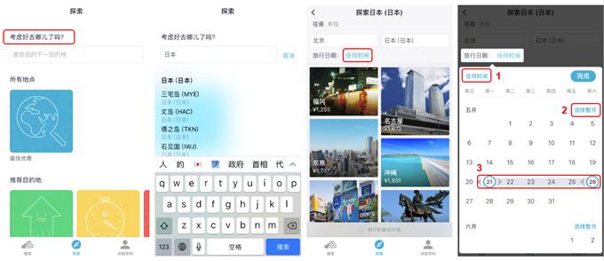 打开探索频道的功能设置,“考虑好去哪儿了吗?”的问候语十分醒目。如果你有想去的地方,但还没想好时间,也没确定飞哪个城市,在这里输入想去的国家试试吧!我们以樱花季最热门的旅行目的地日本为例。