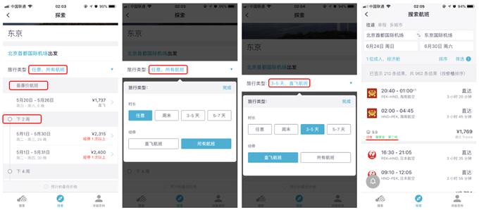 输入日本,会显示出日本多个城市以及对应的最低价机票,就可以根据票价选感兴趣的城市,又或者,进一步看下旅行日期。此刻旅行日期对应的是“任何日期”,点击这个位置,可以看到在探索频道,对应目的地的旅行日期可以有3种选择方式:任何时间、选择正月或指定往返日期。假如不限定旅行日期,我们选择东京,就会出现……