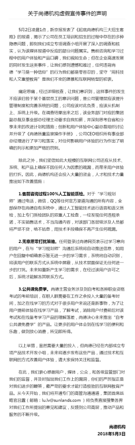 5月4日,就此前新京报报道尚德机构在员工培训和招生过程中存在的多种问题,该机构发布声明做出回应,坦承报道中反映的部分问题属实,并表示事件发生不应归咎于个别员工,而应由公司承担责任,“是公司管理层应该提升管理制度和完善系统的问题”。