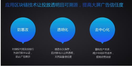大屏广告的经营探索,首先会和行业里面主流的广告平台、品牌做相应的整合,通过资源整合尽可能的提供广告投放效益和从广告到售卖转化率的提升。2018年2月美国出了一份关于区块链在广告领域的白皮书,目前使用比较多的技术方向是充分利用区块链的技术优势,把订单的采购和下达周期做透明,然后做相应的私有云,所有参与者是可以看到的,数据可以共享。纽约的互动广告交易所和纳斯达克共同设立了一个机构,可通过区块链技术让广告订单可以实现再一次的交易,让广告订单实现期货化的交易。利用这些优势可以看到在整个链条,可以做到防篡改,信息透明化,相信未来区块链会在广告商业化产品上进行更进一步的整合。