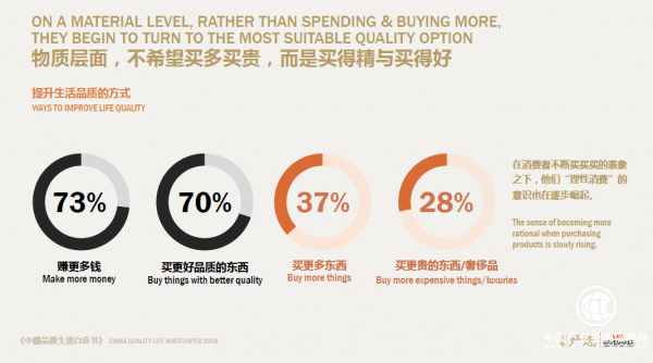 为逐步靠近向往的品质生活,消费者希望精神与物质共同提升。首先,人们积极寻求精神层面及生活方式上的改变。其次,物质层面,在消费者不断买买买的表象之下,他们“理性消费”的意识也在逐步崛起,即不希望买多买贵,而是买得精与买得好。