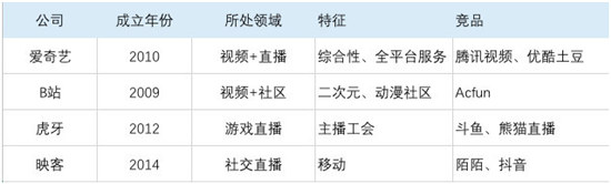 首先,网络视频行业概念很广,从终端来说早期的网页、到PC+移动APP,到现在许多纯移动APP;从属性来说有视频、直播、视频+直播;从内容分布来说有大型综合性平台,也有垂直的影音剧集、社交、游戏、体育、教育等类别。 我们首先理一理这四家(如下图)从成立时间来看,爱奇艺和B站属于一个时期,虎牙是最早是YY旗下的游戏直播业务,映客成立于2014年末期,算是当时的现象级产品,至今不到4年。