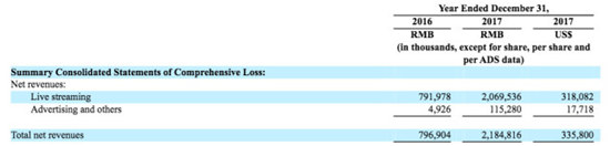 同样映客直播收入占比超过99%,对于收入分成只有平台和主播,映客本身没有工会的形式。但是跟用户数据一样,映客的收入2017年对比2016年是下滑的,同比减少了9%。
