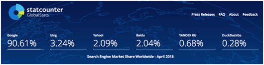 Stats发布了2018年2月份的搜索引擎数据报告。在全球搜索引擎的市场份额排名中,Google的市场份额达到90.61%,保持着全球最大的搜索引擎,