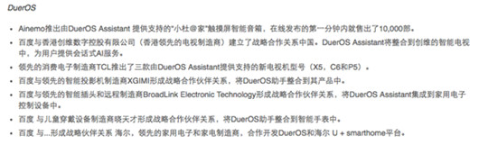 为用户提供完整的服务链条DuerOS通过云端大脑时刻进行自动学习让机器具备人类的语言能力,广泛适用于智能玩具、蓝牙音箱、智能小家电等多种设备。