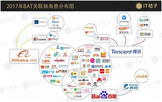 BAT也就是百度、阿里巴巴、腾讯,已经成为中国最大的三家互联网公司。中国互联网发展了20年,现在形成了三足鼎立的格局,这三家企业拥有宽广的护城河,从战略布局来说,在2017年独角兽榜单中,有