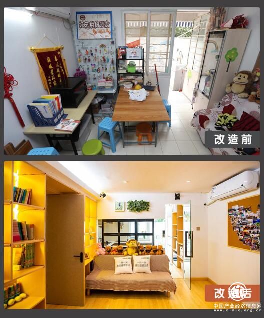 改造前的天井,地面板砖比较滑,容易产生安全隐患。妈妈们在这里难得有空闲时间,却只能站着聊天。改造后的天井生意盎然,防滑地板的设计让大家在这里活动时能更安全,墙边种植的绿植花卉让大家更亲近自然。安顿好孩子之后,妈妈们还可以在小院里喝喝咖啡了。