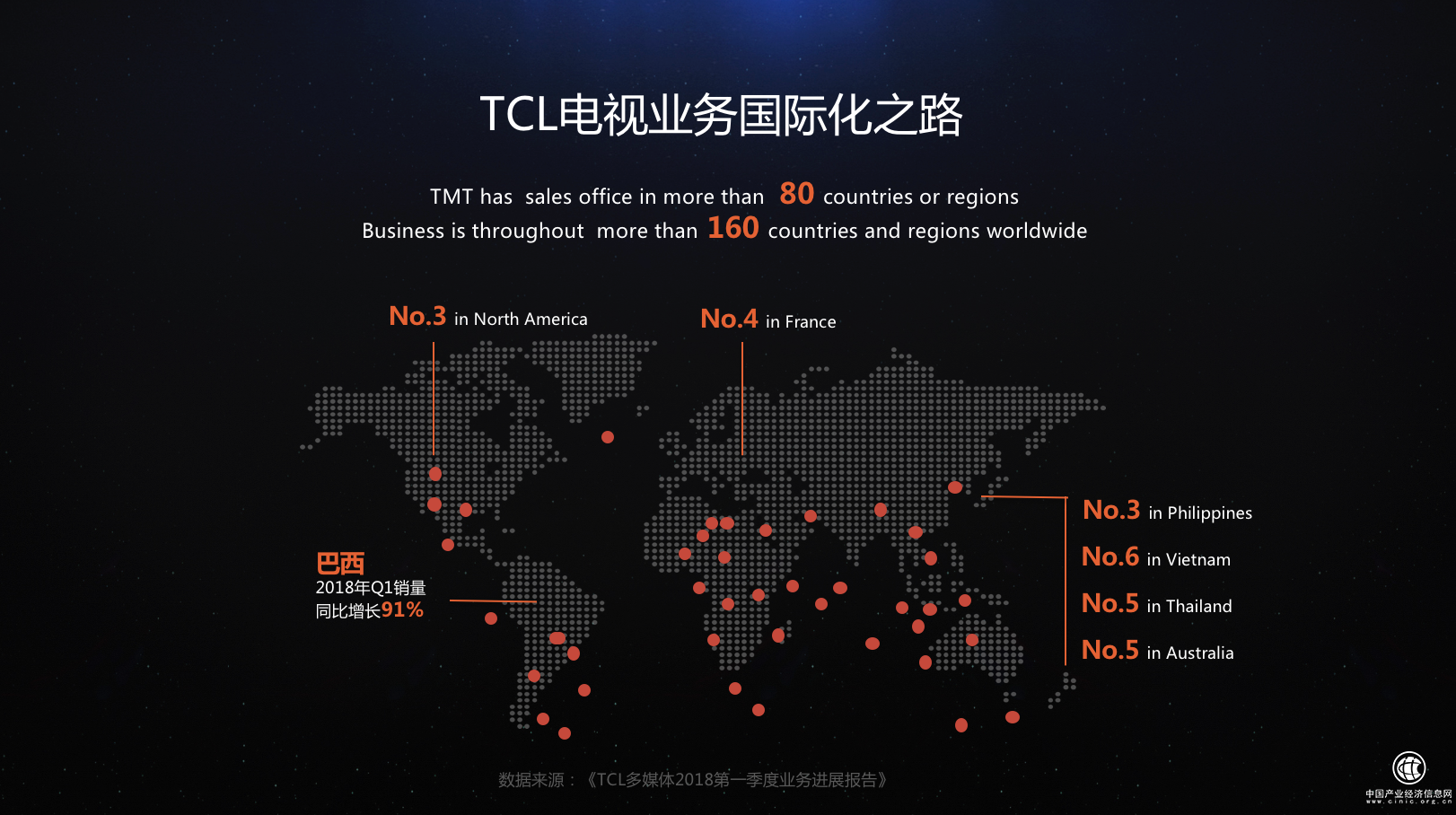 从2002年—2018年,经过16年的经精耕细作,TCL在全球80个国家和地区建立了办公室,同时据2018年的销量统计,在亚洲,菲律宾市占率第一,泰国第五,越南第六,澳大利亚排第五,法国排第四,在北美已经排到第三了,巴西第一季度的增长也是91%。