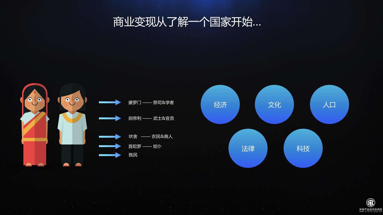 在商业变现上陈总表示,商业变现要从了解一个国家开始,上图左边是印度种姓的特点。从印度人的姓名当中,就可以看出他是高等人、低等人、贱民,他们受教育的程度也会根据不同的种姓有一个匹配。百分之多少的人能接受教育,这个例子,说明不同的国家可能会有不同的文化,不同的人口。