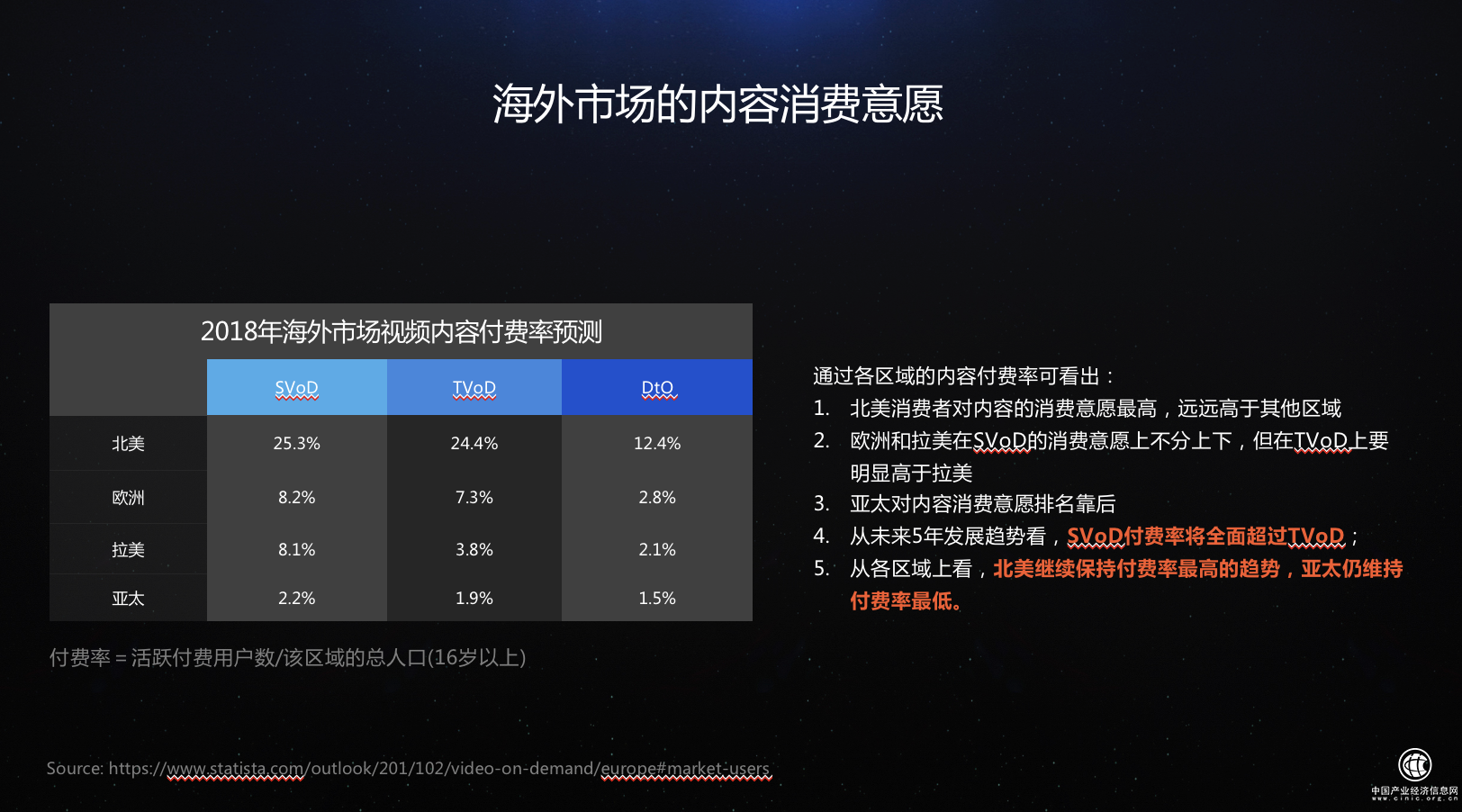 最后是全球OTT电视和视频市场营收预测,到了2010年,排名第一的依然是北美,不过从2016年-2021年数据可以看出:未来5年,亚太将超过西欧成为营收TOP2。